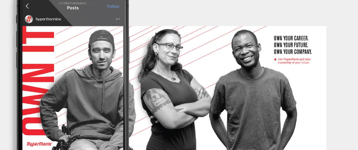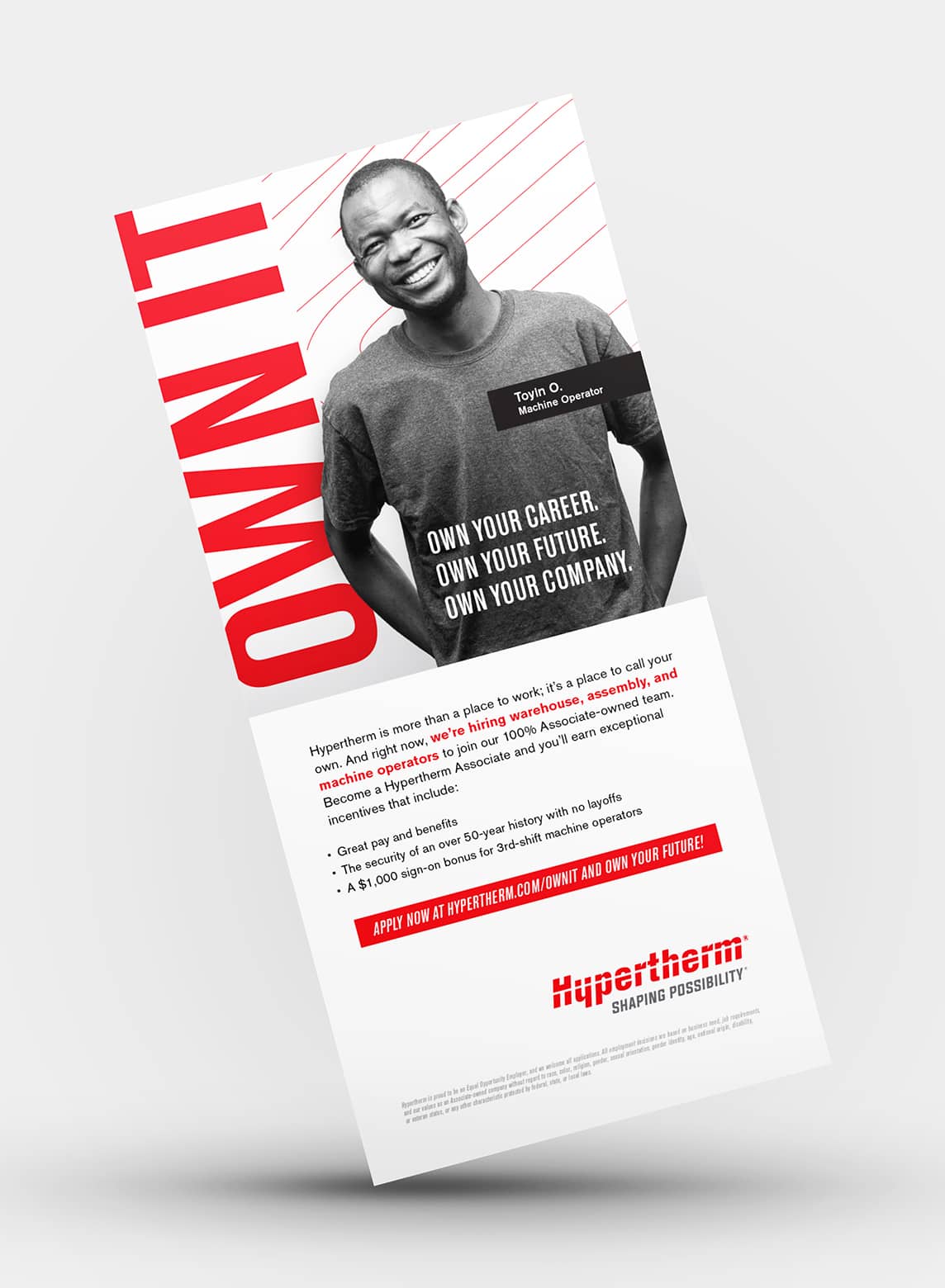 Hypertherm Associates does things differently. It’s a company that’s 100% owned by its Associates, and that’s a big deal. So, we made their recruitment campaign a big deal. The graphics are bold, the copy is tight, and the message is clear: work for Hypertherm Associates, and you’ll own your future.