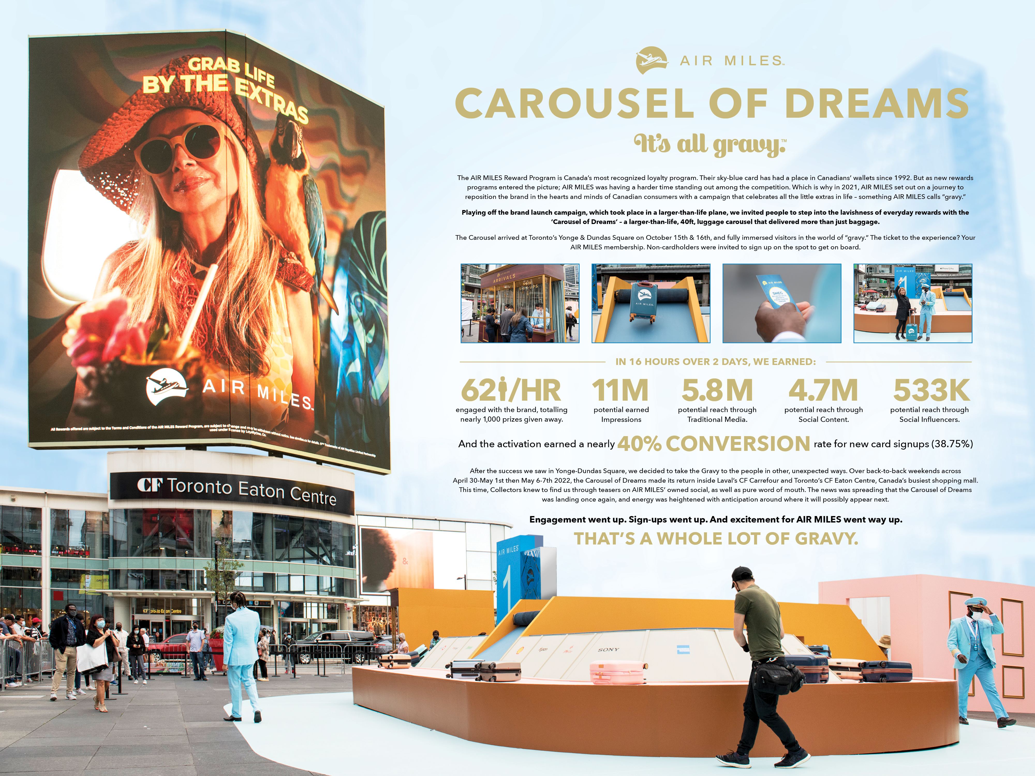 Housed at Yonge & Dundas (Canada’s Times Square), the larger-than-life, 40ft baggage carousel became our biggest ever activation delivering luggage, and all the extras in the form of prizes, to over a thousand eager collectors over one weekend, recruiting more than 40% of them to the program. Following the success of that weekend, we activated in malls in two cities across Canada and in 2023, launched a permeant virtual version of the carousel in the AIR MILES mobile app, how’s that for extra gravy!