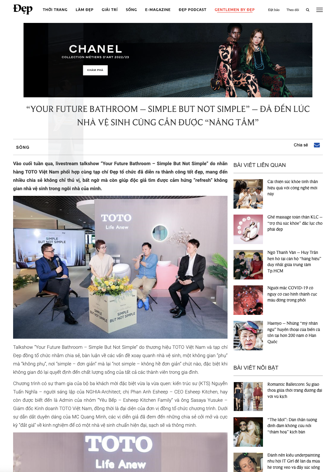 - More than 2M views on the video on TOTO Vietnam fanpage and some hot fanpages - TOTO Vietnam Attract more than 2.600 people to watch the livestream of the talk show on TOTO Vietnam fanpage - 6 posts from KOLs introducing about the talk show and review the product, attracting more than 11.00 interactions - More than 22.000 views of PR articles on website of Dep magazine