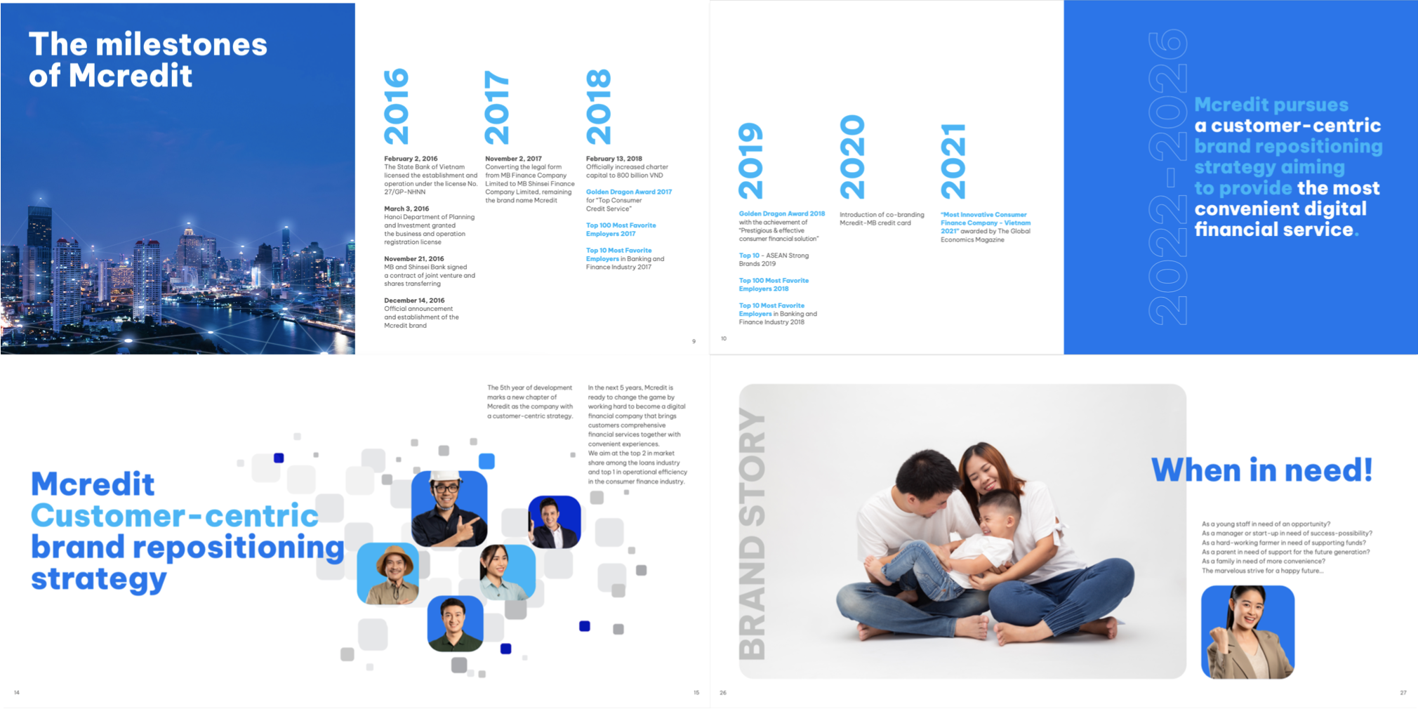 Mcredit is a joint venture finance company between MB Bank and Shinsei Bank (Japan). After 5 years of establishment and development, Mcredit collaborated with the Le Bros team to re-identify its brand, changed its business strategy and brand strategy with the hope of bringing more values to customers. Le Bros has successfully repositioned the Mcredit brand and spread the new Mcredit brand identity image to internal, public, target customers, and partners of Mcredit.