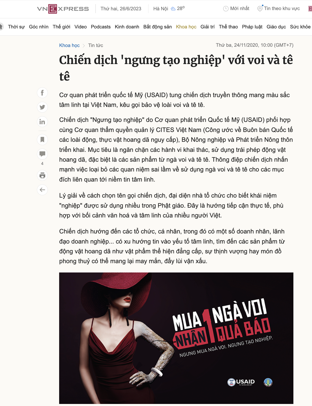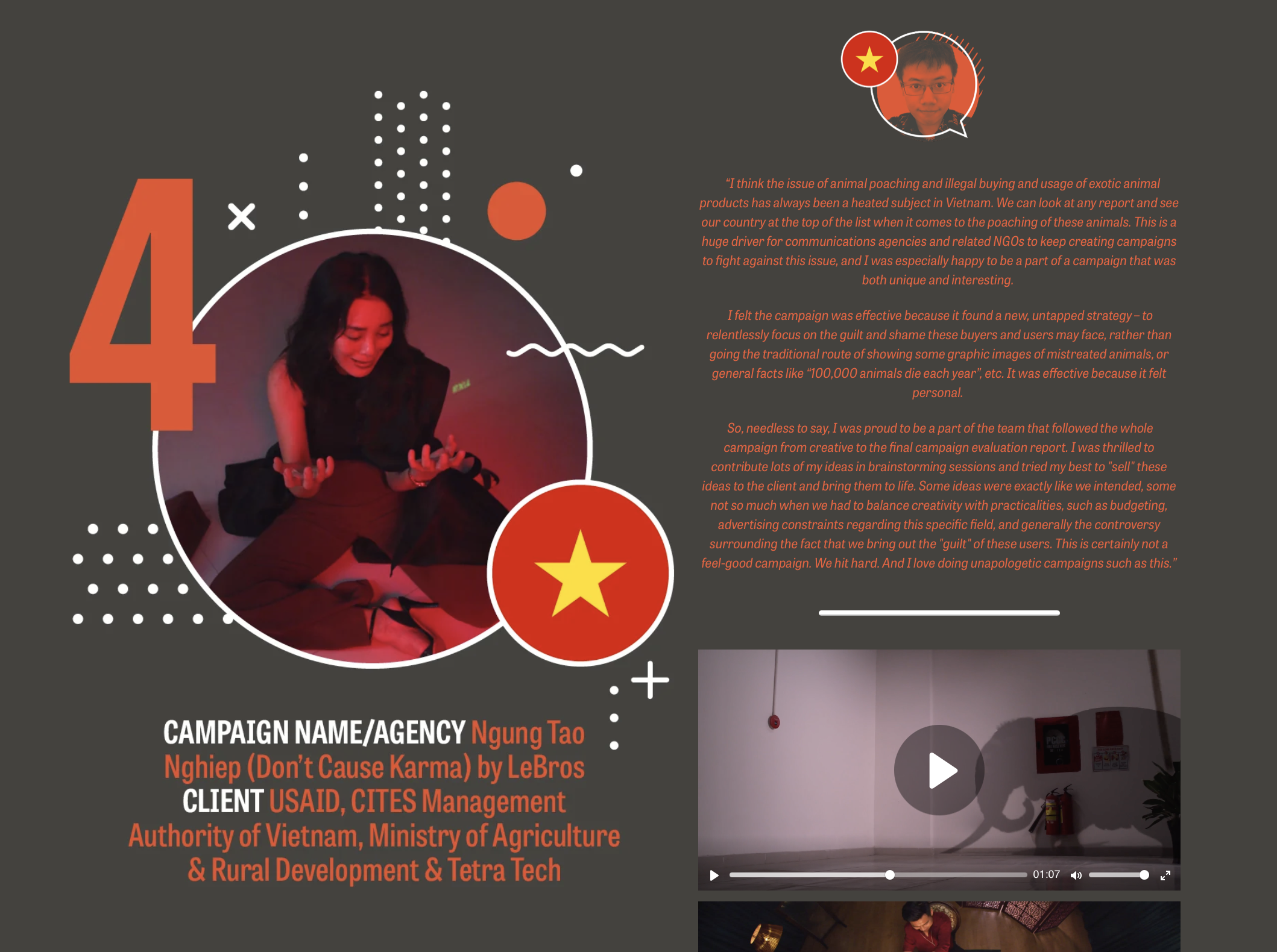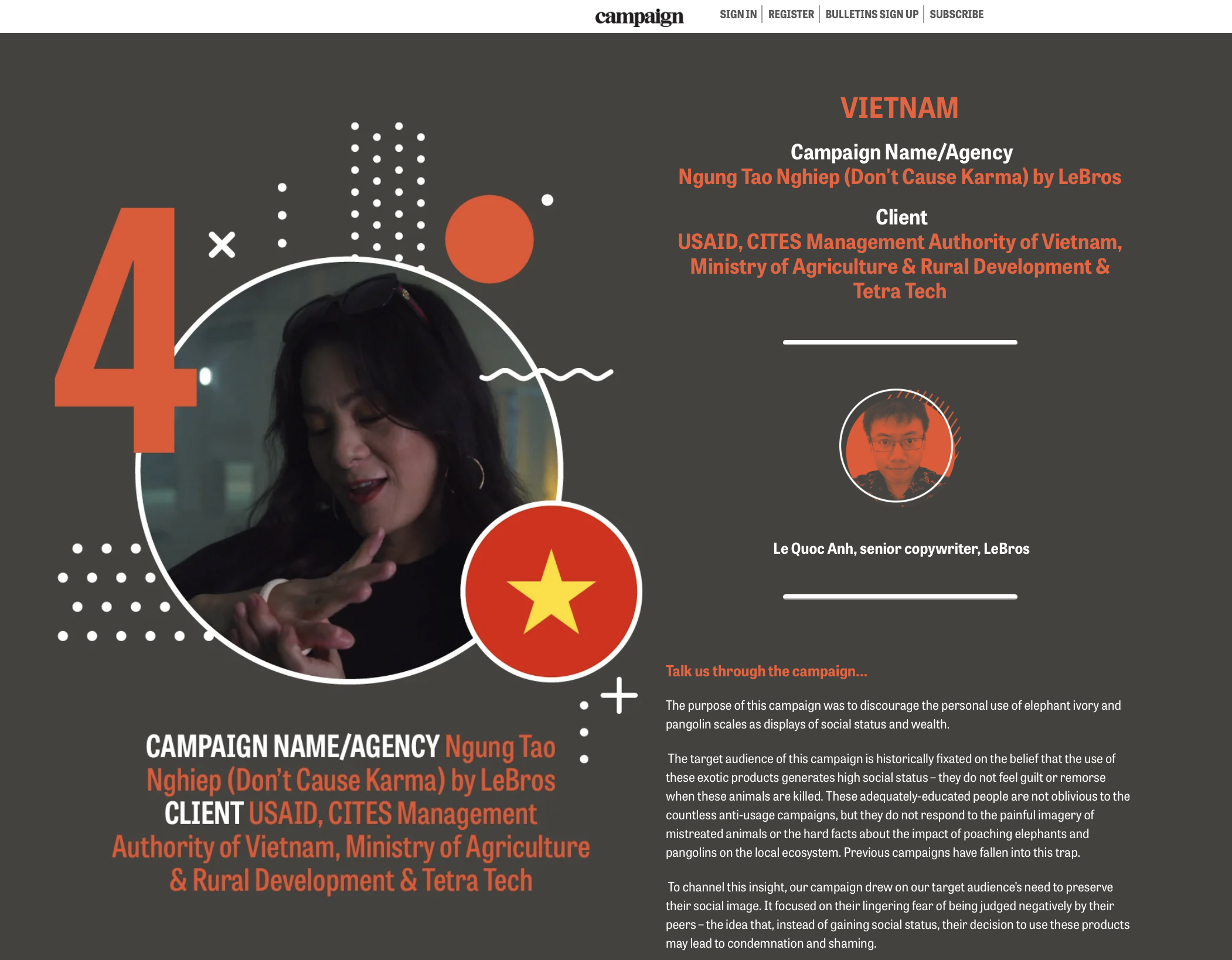 With the campaign "Ngung Tao Nghiep" (Stop Causing Karma), Le Bros implemented behavior-changing communication campaign aiming to reduce demand for ivory and pangolin products in Vietnam.